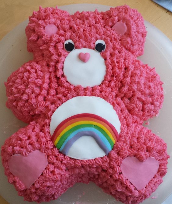Colorful Care Bears Party Idea #12: This Care Bear Cake looks absolutely amazing! From Cheer Bear’s cute rainbow belly badge to his adorable little button heart nose, this cake is definitely going to be the center of attention at your Care Bears party!