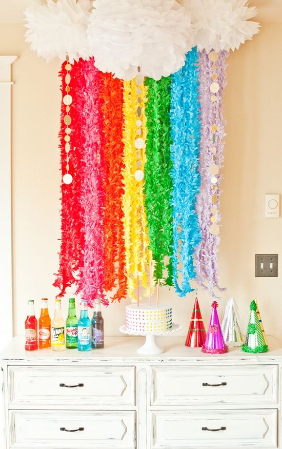Colorful Care Bears Party Idea #13: This Rainbow Party Backdrop looks so vibrant and festive! Hanging rainbow colored garlands like this beneath a fluffy paper cloud is a thrifty but pretty alternative to having huge printed backdrops.
