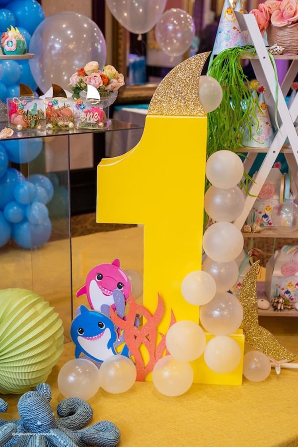 Baby Shark Party Idea #4: How amazing are these Baby Shark Party Decorations?! The standing decorative number sign with the sharks, the little balloons and the adorable octopus certainly make this party extra special.