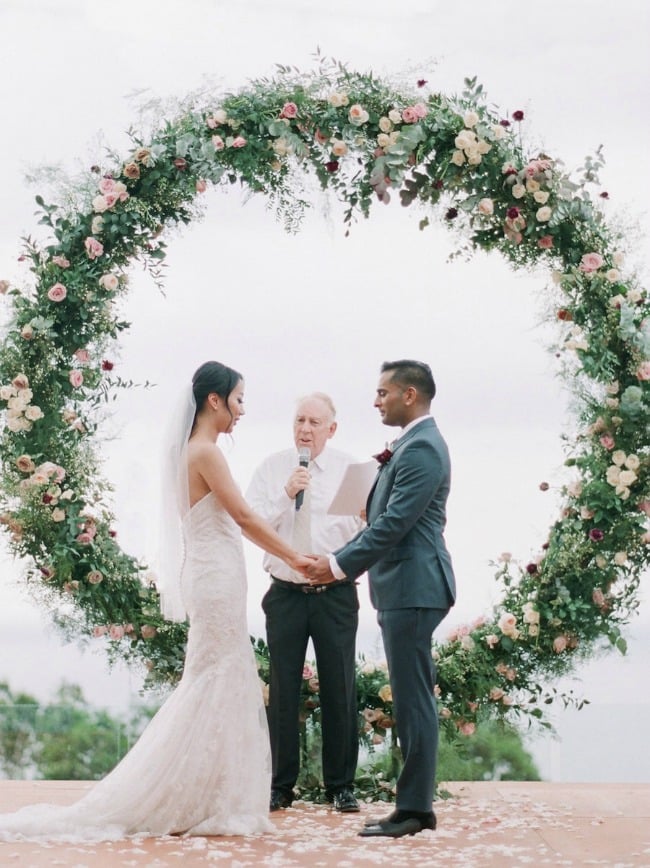 Today, the wedding arch has evolved and we love seeing how creative people can get for their weddings. One trend we’re totally loving right now is the circular wedding arch. These oversized wedding arches decorated with flowers are absolutely stunning and can be personalized by the bride’s wedding colors and theme.