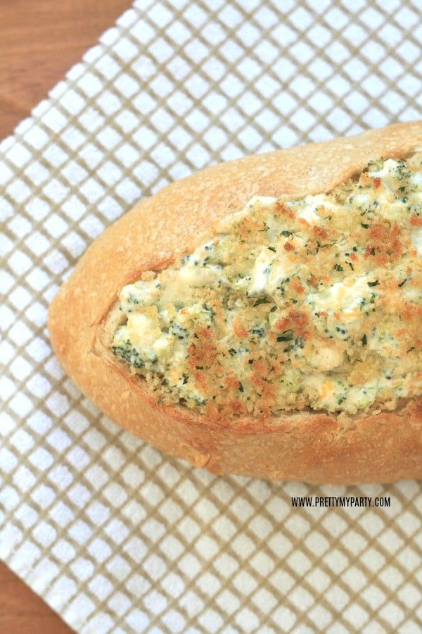 Now, head on over to that fabulous party you were invited to and bring along your amazing appetizer of Baked Broccoli Parmesan Dip! If you have any extra that didn’t fit into the bread bowl, feel free to add it into its own serving bowl and take it along, as well.