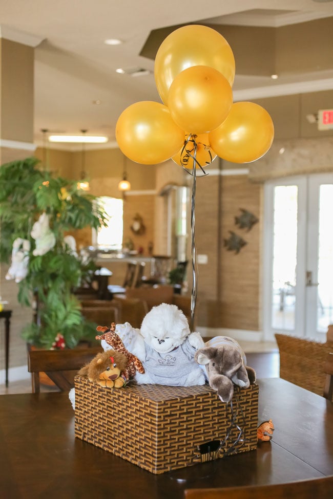 Tables were decorated with assorted jungle animal toys dressed in baby clothes and holding gold balloons (all meant for baby to enjoy after the shower!).