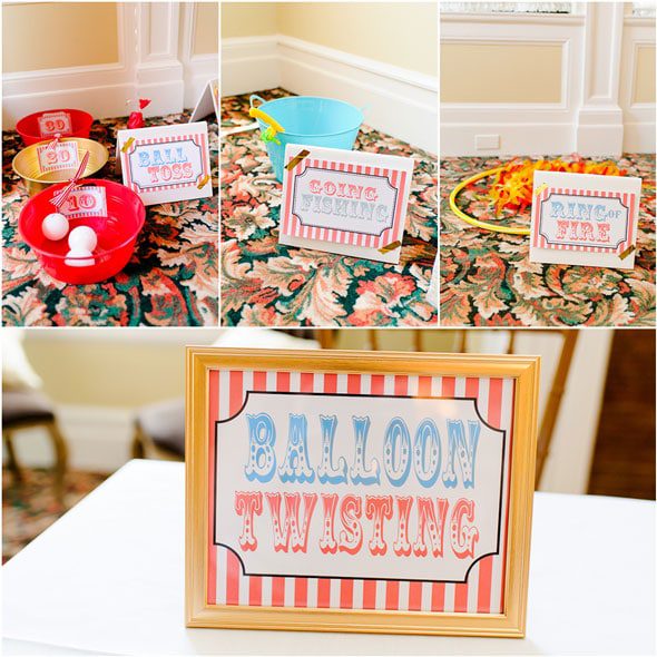 Of course, every circus theme party has to have fun circus games and activities and this one definitely didn’t disappoint! All of the kids were treated to face painters from Just Plain Crazy Face Art and More, along with balloon artists from Lollipop Party Services. The “Hungry Hungry Lukey” game used photos taken by Crystal Satriano Photography, which mom had printed as an engineer print from Staples. She than attached it to two pieces of white foam board, purchased some fun foam noses, which then needed to be tossed through Lukey’s mouth into a red bucket. The kids loved it! They also got to play many other games like “Ring Of Fire,” “Ball Toss,” and “Going Fishing.” Mom created all of the signs herself on her home computer and put together all of the games with different things she purchased and had around the house. Amazing!