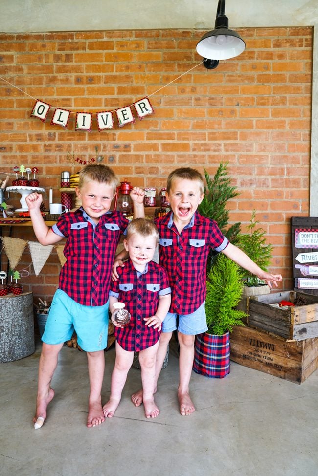 Birthday boy Ollie (2 years, the one with chocolate log on his nose) surrounded by his awesome big brother loggers Will and Tom. The matching plaid shirts – awesome touch! Such a creative lumberjack birthday party!