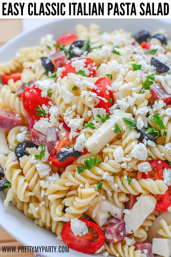 Looking for a quick and easy pasta salad? This Classic Italian Pasta Salad Recipe makes a great side dish, feeds a large crowd, and is perfect for any party or potluck!
