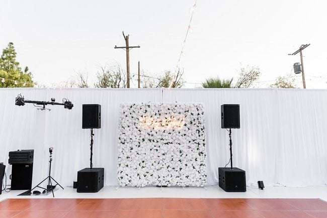 Everything couldn’t have been more beautiful for this amazing Elegant White Backyard Engagement Party! There are so many gorgeous details, it’s hard to decide which is our favorite. We definitely love the amazing floral wall that was created with a neon sign of the couple’s names. Everyone was able to use it as a photo backdrop, with special photo instructions that everyone was able to utilize. But then there is the amazing dessert table, which looks picture perfect! We just love the elegant cakes that fit into the theme perfectly. What a gorgeous dessert table, with white and green florals prevalent as decor.