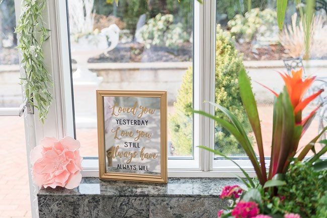 The dessert table was also beautifully designed, with help from friends and family. We just love the pink and gold macarons, along with the different cakes made by Caked Up Cafe. Everything about the event was absolutely breathtaking. It felt like the entire shower was held in a greenhouse, with all of the windows bringing in the gorgeous natural light from all directions.