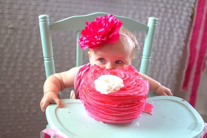 Mom Erin put together this adorable Pink Ombre First Birthday Party for her daughter, Bridget. She choose to do a pink ombre theme with some aqua accents. She did an amazing job on the pink ombre ruffle cake! Her wooden high chair was painted aqua and ruffle streamers were made for the background. Favors included candy bars with handmade wrappers to match the party and chocolate drizzled popcorn. Mom’s favorite feature was the photo display on the fireplace mantel. Each month, she would take a photo of her daughter on her chair to show her growth. She found some wooden frames at Michaels that she spray painted different colors of pink and put the photos in them. How sweet! What a great Pink Ombre First Birthday Party!