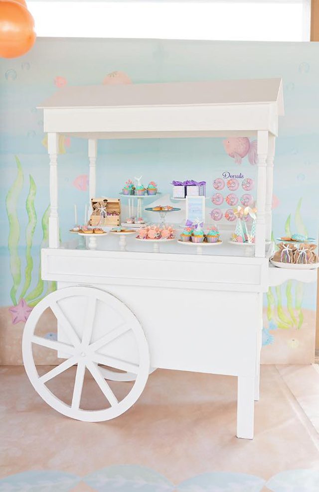- White dessert cart with mermaid and under the sea themed desserts