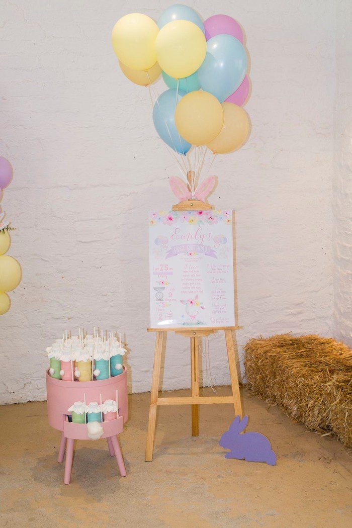 One Fine Day Parties & Events of South Africa, styled this super adorable Some Bunny is One 1st Birthday Party! There’s nothing more adorable than cute, little bunnies as the inspiration behind a first birthday theme, especially if the birthday is near Easter. Sweet pastel party supplies and decor filled the space, including fun pastel balloons on the guest tables and around the dessert table and party favor cart.