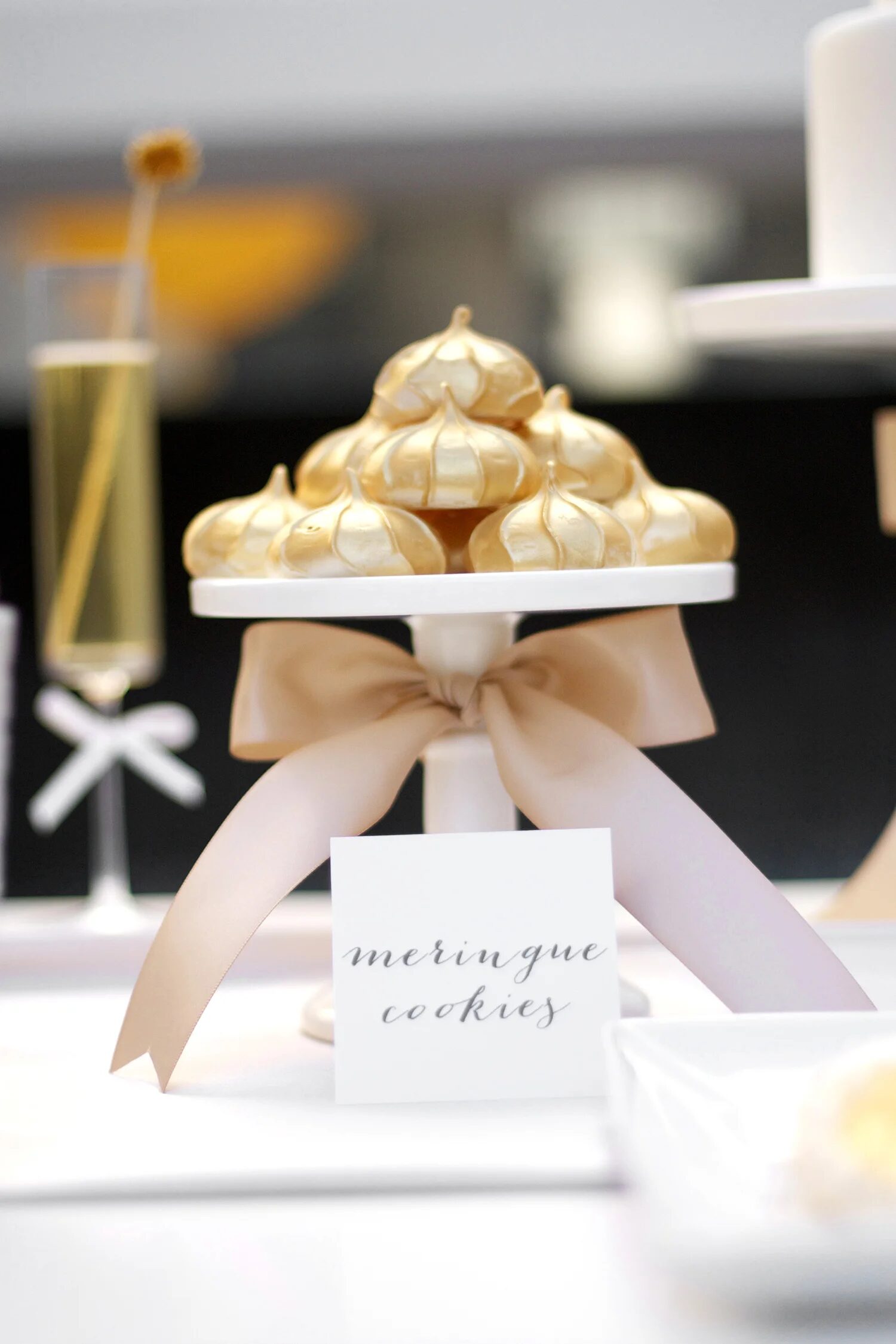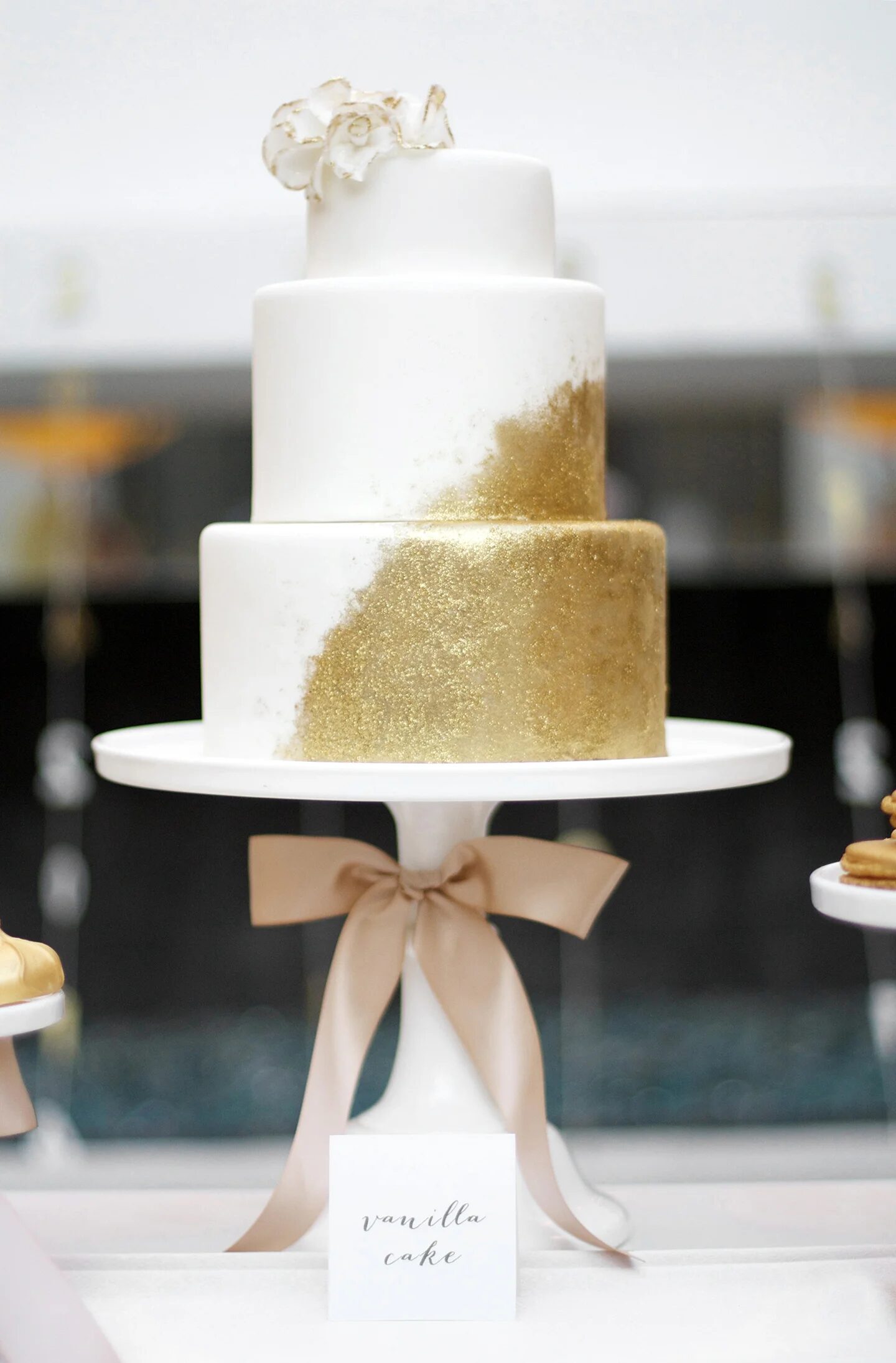 A stunning cake from Inspired Sugar takes center stage, featuring metallic details inspired by a glitter-splashed pillow. It instantly draws attention and anchors the entire table.