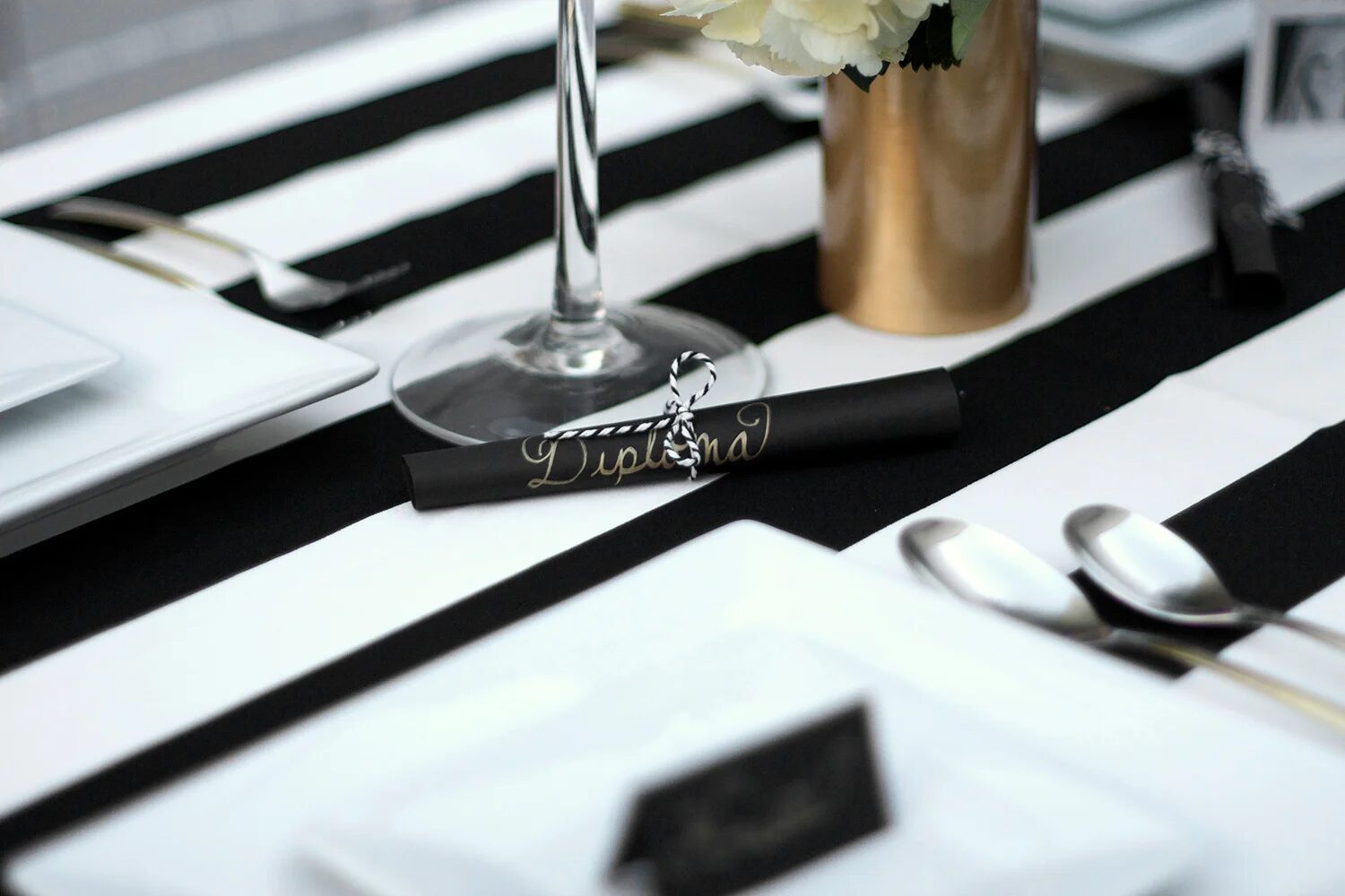- Mini diploma favors made with black construction paper, twine, and a gold paint pen