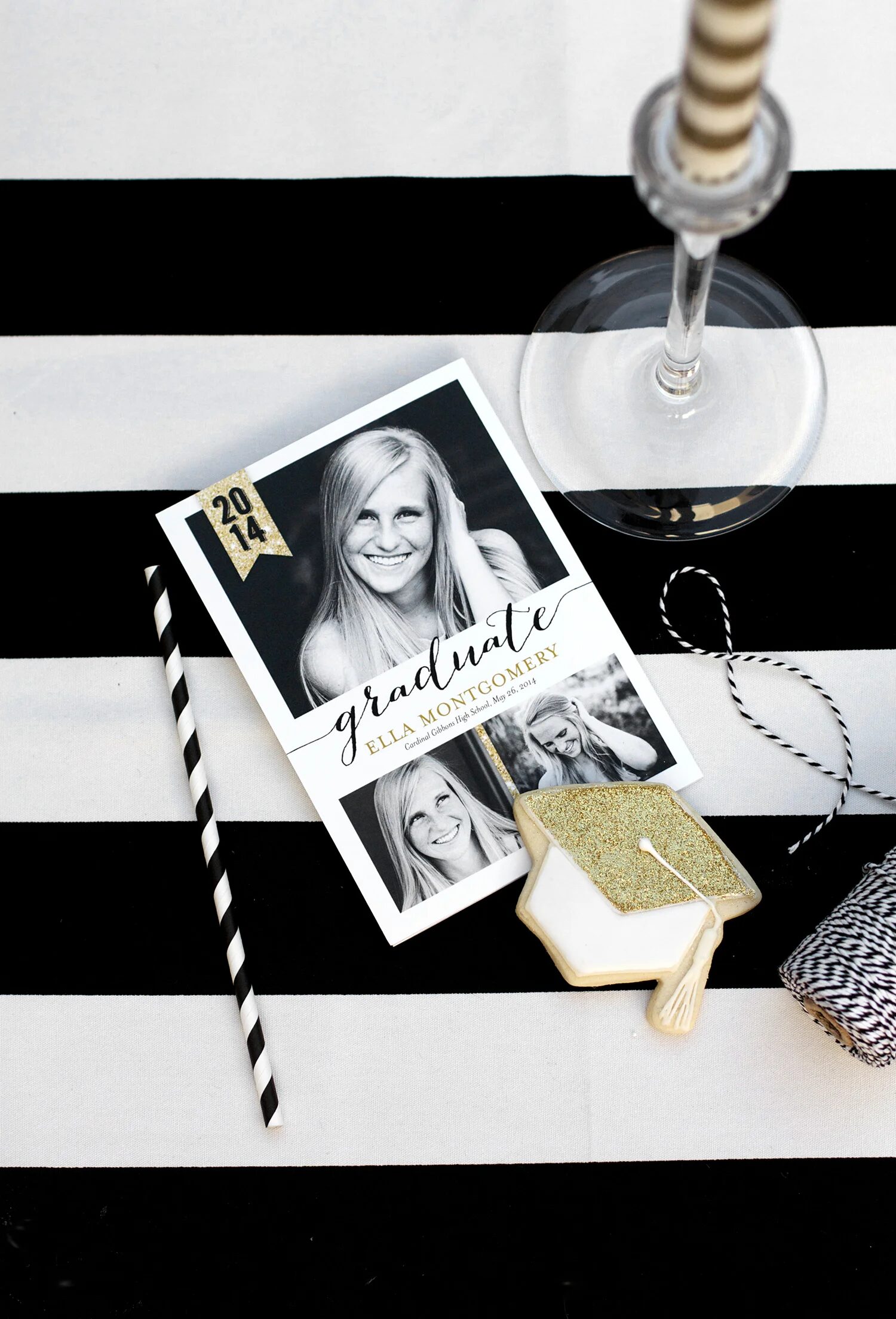 Every great graduation party starts with a beautiful announcement and invitation, and this one sets the stage perfectly. A shimmer-and-shine graduation announcement from Shutterfly introduces the gold theme from the start, giving guests a preview of the stylish celebration to come.