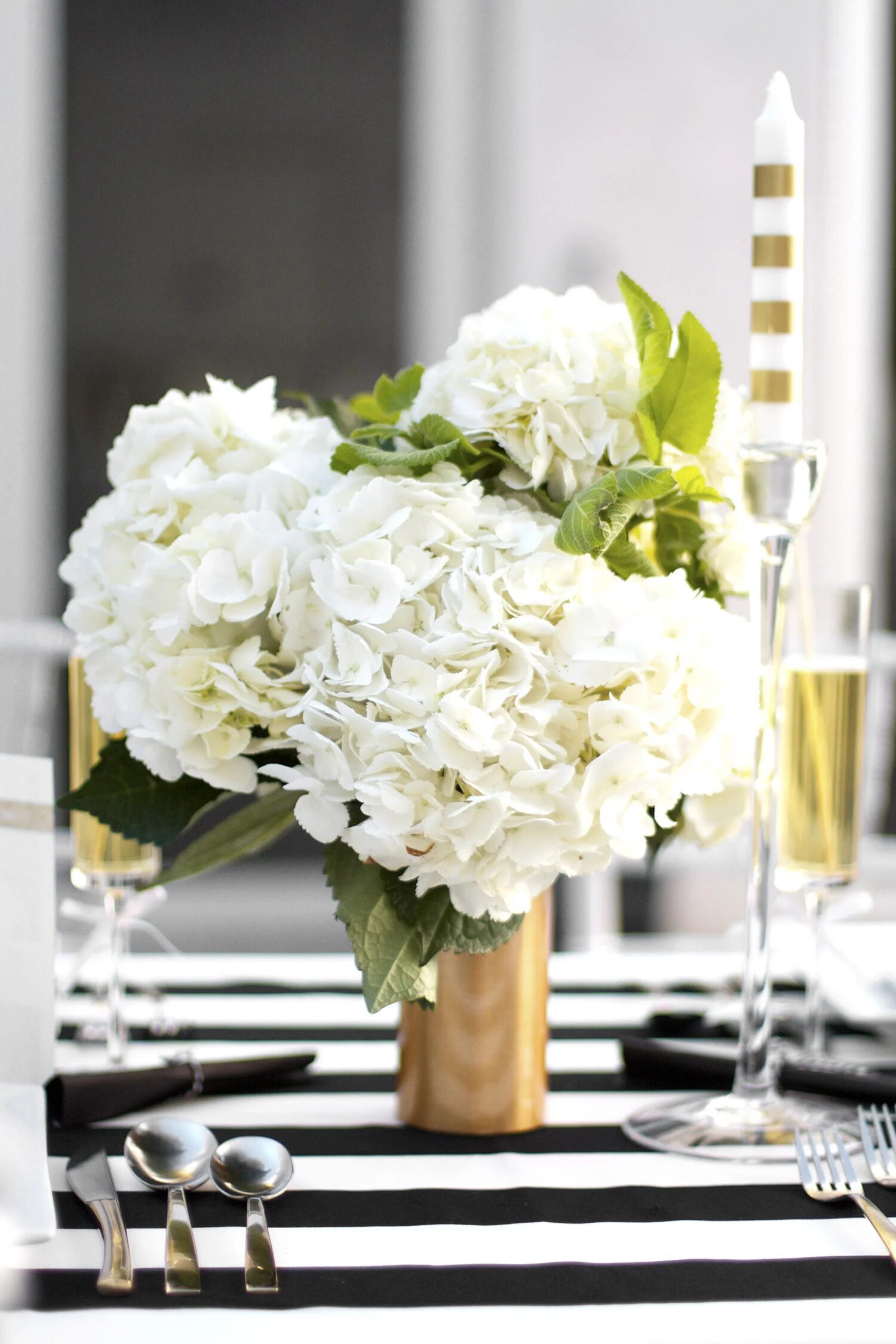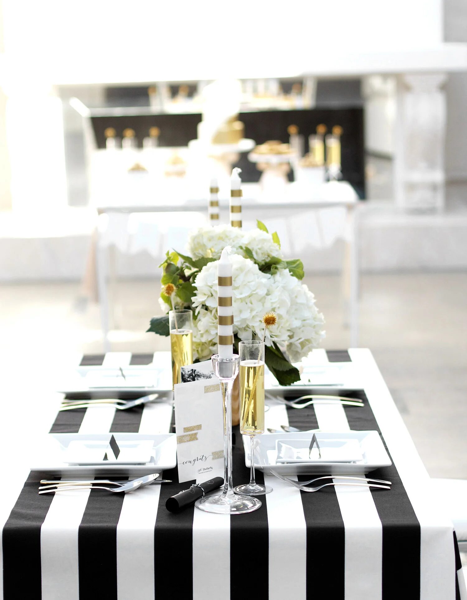 A black-and-white striped tablecloth creates the perfect backdrop, allowing the gold accents to truly shine. Layered with metallic details and clean lines, the overall look feels modern, crisp, and effortlessly elegant.