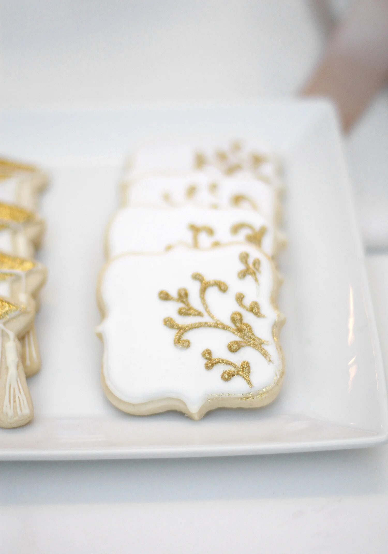 - Glittery graduation cap cookies on white serving platters that double as edible art