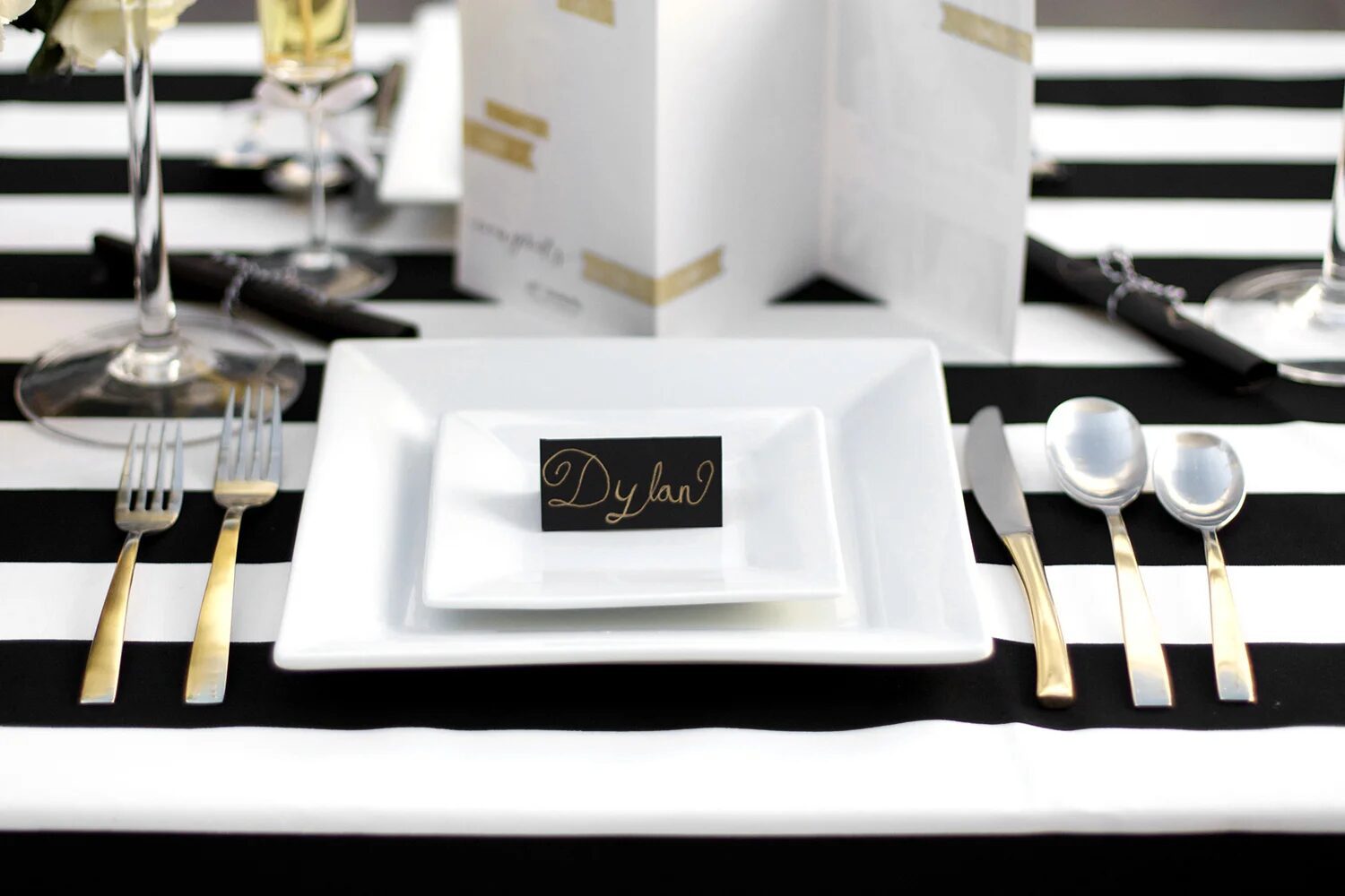 - Handwritten place cards using black cardstock and gold calligraphy ink