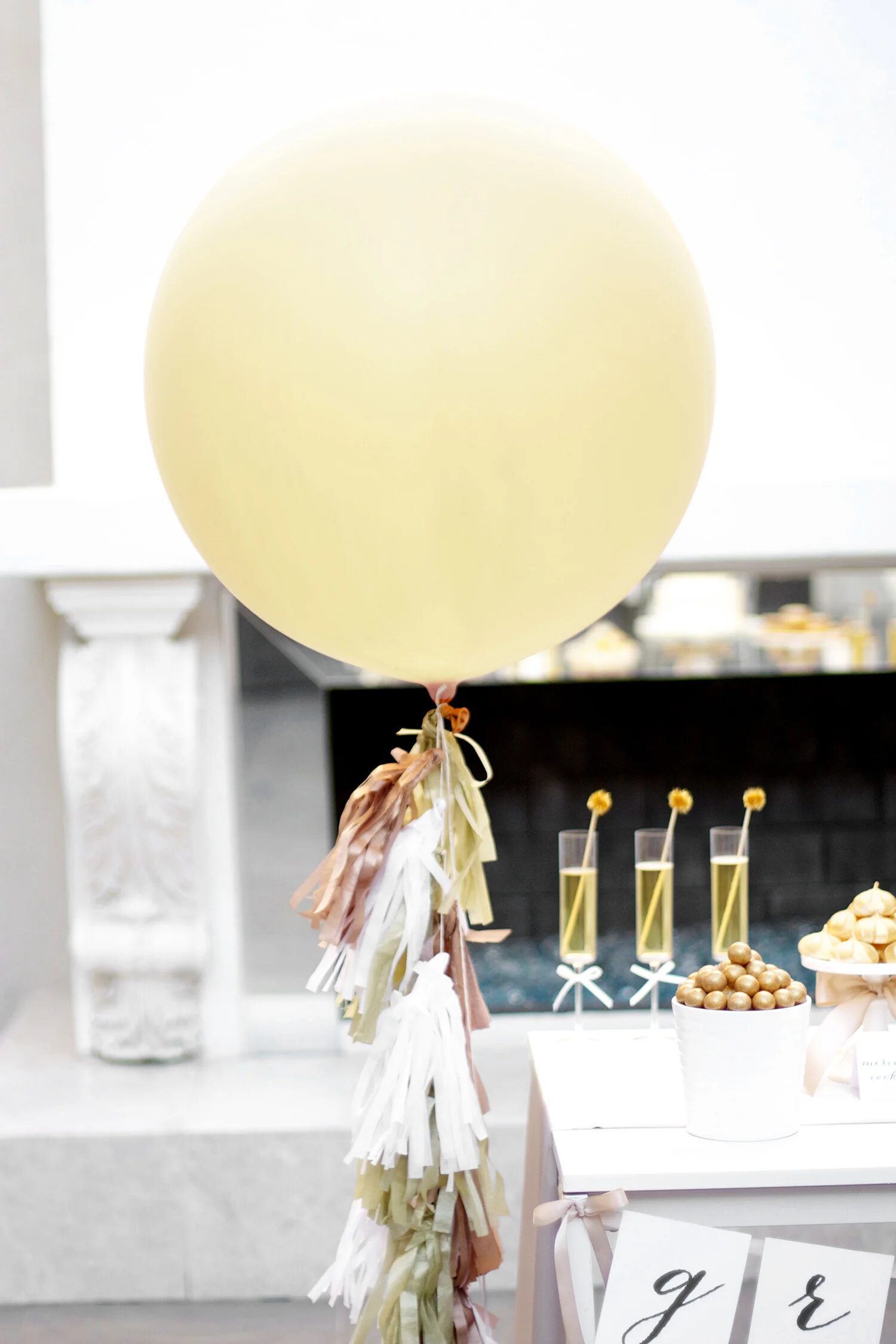 - Oversized 36-inch balloons with fringe tassels add height and movement