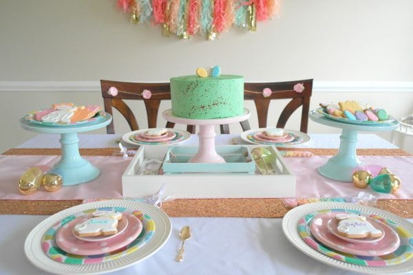 This pastel rainbow palette sure shines with all the white from the bunnies, the tablecloth, and cake plates.