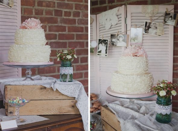 The bridal shower cake was a white ruffled cake with a pink peony on top. The cake was beautiful and perfect for this special occasion.