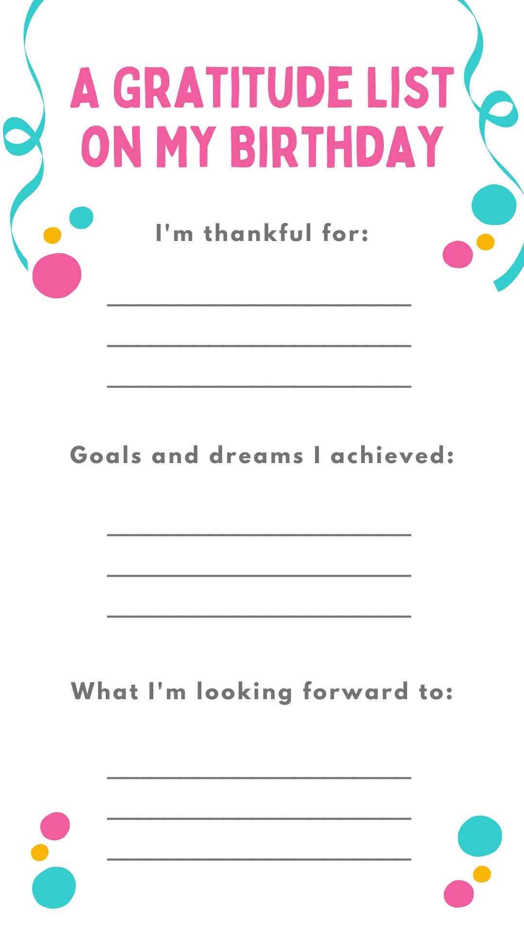 - Grab this FREE Printable Birthday Gratitude List and write down the goals you’ve achieved and things you’re grateful for