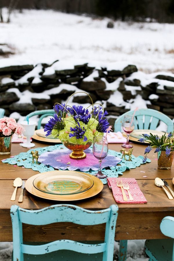 The weather cooperated and they had a fresh blanket of snow for their beautiful pastel winter wonderland and unicorn wedding editorial. The vision behind this styled shoot was lots of pastel colors, with pops of bright & gold, tulle, and a unique bride and groom! Aubrey made the PERFECT unicorn bride with her fabulous pink hair! Everyone had a blast frolicking in the snow!