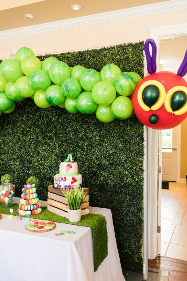- The back splash for the dessert table was the incredible hungry caterpillar party balloon installation that was found on top of the station