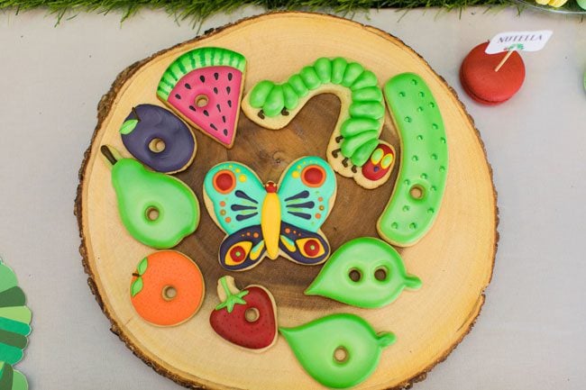 - This Very Hungry Caterpillar dessert table included an incredible rainbow macaroon tower, along with incredible caterpillar and butterfly cookies