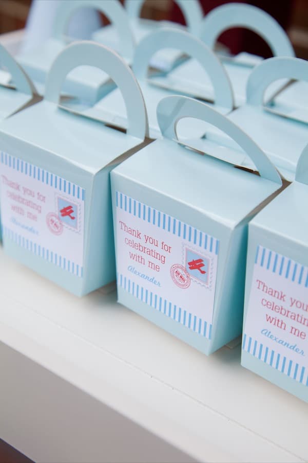 Adorable “air mail” favor boxes were given to each party guest at the conclusion of the event. What a sweet Vintage Airplane First Birthday Party for a very lucky little boy!