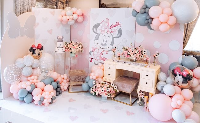 - A Minnie Mouse birthday party with a soft color palette of light pinks, grey and white was used to lighten the mood